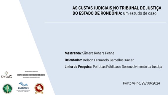 A servidora Sâmara Rohers Penha, da Divisão de Gestão e Apoio ao 1º Grau (Digea1G), que integra o Departamento Judicial da Corregedoria-Geral da Justiça, defendeu recentemente, como dissertação de mestrado, um estudo de caso intitulado “As Custas Judiciais no Tribunal de Justiça do Estado de Rondônia”. A pesquisa foi realizada no âmbito do Mestrado Profissional Interdisciplinar em Direitos Humanos e Desenvolvimento da Justiça (DHJUS), oferecido pela Universidade Federal de Rondônia (UNIR), durante parceria com a Escola da Magistratura de Rondônia (Emeron).