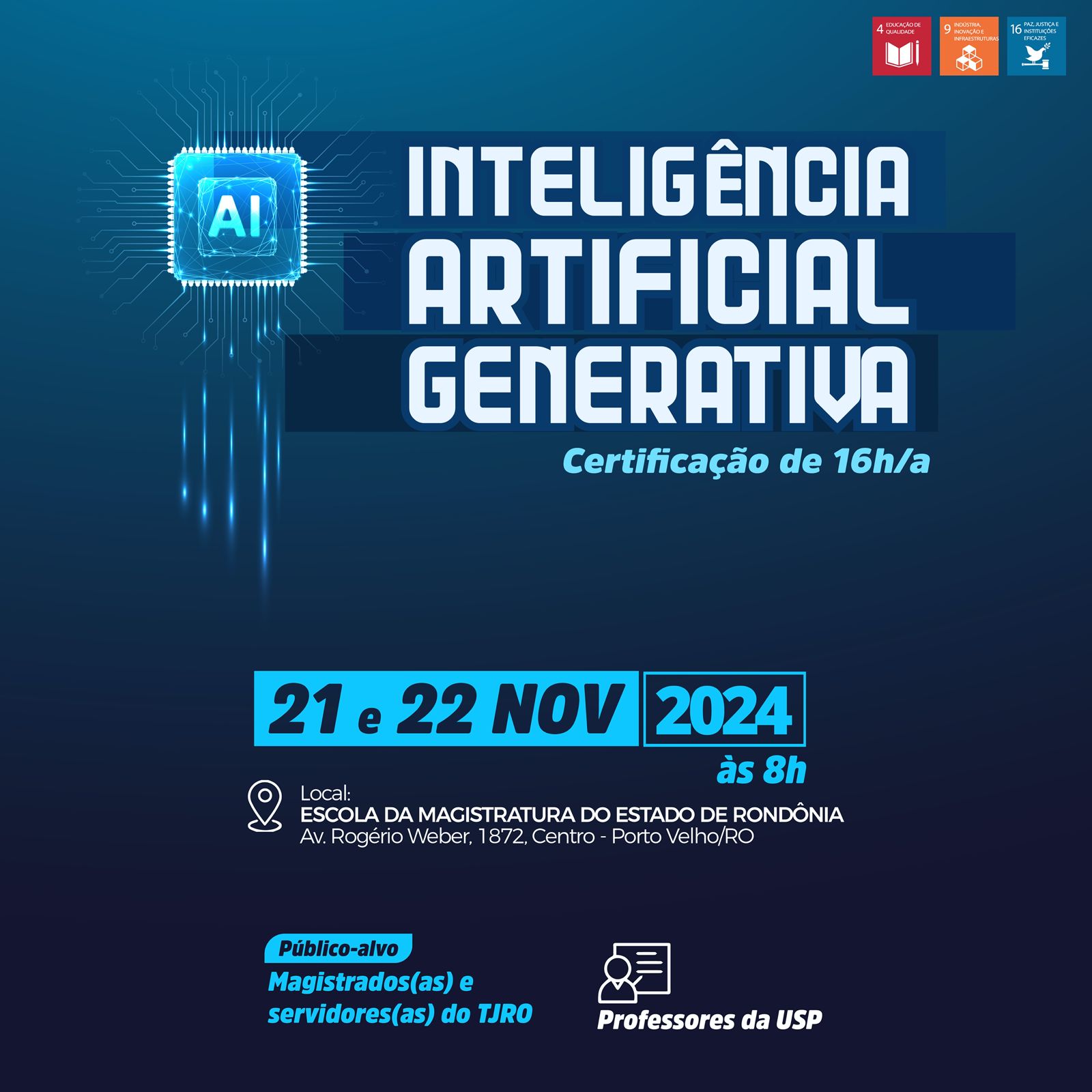 A Escola da Magistratura de Rondônia (Emeron) abriu inscrições a magistrados(as) e servidores(as) do Tribunal de Justiça de Rondônia para o curso “Formação Continuada em Inteligência Artificial Generativa”, que será realizado nos dias 21 e 22 de novembro, na sede da Emeron em Porto Velho. Ministrado por professores da USP, o curso visa proporcionar aos participantes uma compreensão aprofundada sobre o potencial da Inteligência Artificial Generativa (IAG) no contexto judiciário.