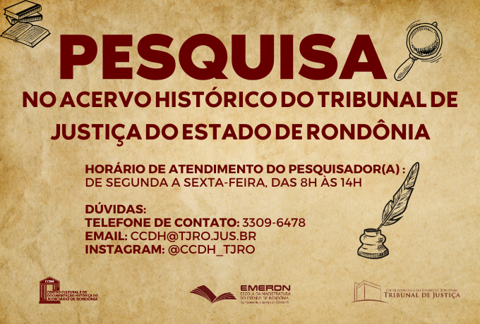 O horário para atendimento do pesquisador(a) é de segunda a sexta-feira, das 8h às 14h. Em caso de dúvidas, entre em contato através do email Este endereço de email está sendo protegido de spambots. Você precisa do JavaScript ativado para vê-lo. ou via instagram @ccdh_tjro.