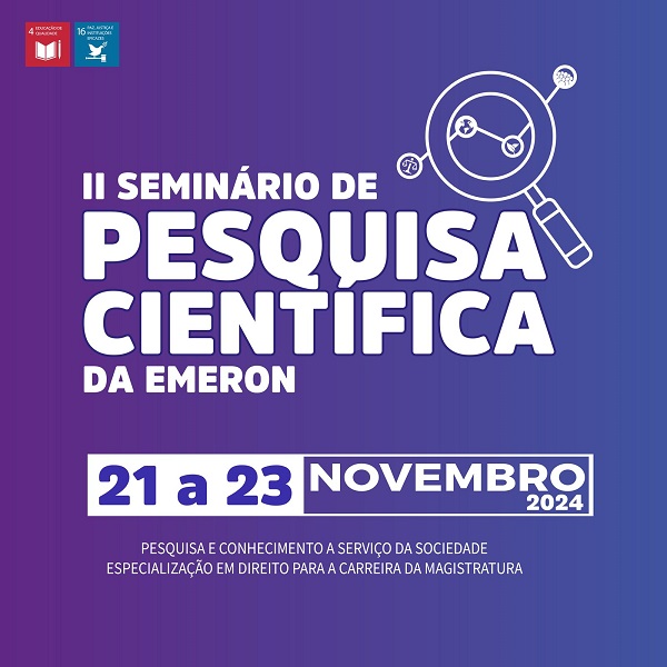 A Escola da Magistratura de Rondônia (Emeron) abriu as inscrições para o II Seminário de Pesquisa Científica da Especialização Lato Sensu em Direito para a Carreira da Magistratura, que acontecerá de 21 a 23 de novembro de 2024, no auditório da sede da Escola em Porto Velho (Av. Rogério Weber, 1872, Centro).