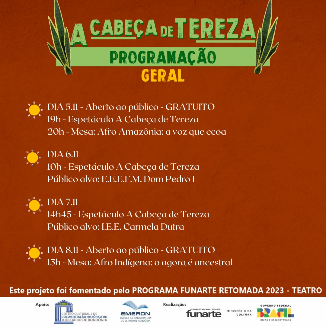 Vinculado à Escola da Magistratura de Rondônia (Emeron), o Centro Cultural e de Documentação Histórica (CCDH), em apoio ao projeto fomentado pelo Edital da Fundação Nacional de Arte (FUNARTE), recebe o espetáculo teatral “A Cabeça de Tereza”. As apresentações gratuitas serão de 5 a 8 de novembro, no auditório do CCDH. Haverá ainda mesas de debates pela Semana da Consciência Afro Amazônica.