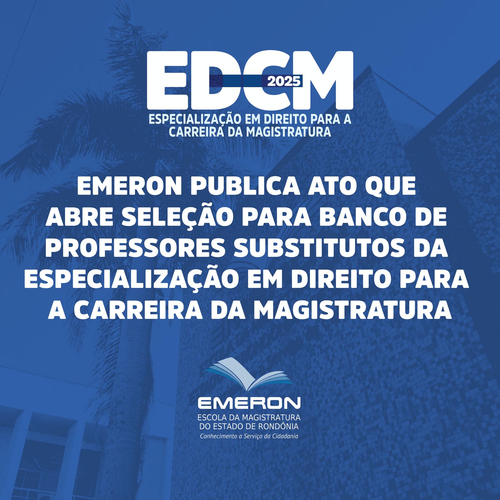 A Escola da Magistratura do Estado de Rondônia (Emeron) publicou na sexta-feira (8), no Diário da Justiça, o Ato Nº 16/2024, que abre seleção para formação de cadastro de magistrados(as) interessados(as) em atuar como professores substitutos no curso de Pós-Graduação Lato Sensu Especialização em Direito para a Carreira da Magistratura (EDCM). As inscrições estão abertas até o dia 8 de dezembro de 2024.