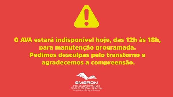 A Escola da Magistratura de Rondônia (Emeron) informa a indisponibilidade do Ambiente Virtual de Aprendizagem (AVA) nesta terça-feira, 12 de novembro, por motivos técnicos.