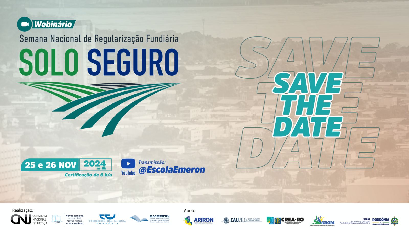 A Escola da Magistratura do Estado de Rondônia (Emeron) realizará nos dias 25 e 26 de novembro de 2024 o Webinário da Semana Nacional de Regularização Fundiária — Solo Seguro 2024. O evento tem objetivo de disseminar conhecimentos sobre as normas jurídicas e etapas de regularização fundiária, especialmente no contexto da Amazônia Legal, com foco na melhoria de políticas públicas nos municípios de Rondônia.