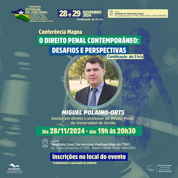 A Escola da Magistratura de Rondônia (Emeron) realiza, no dia 28 de novembro, às 19h, a Conferência Magna - O Direito Penal Contemporâneo: desafios e perspectivas, com o doutor em Direito e professor de Direito Penal da Universidad de Sevilla, o espanhol Miguel Polaino Orts. O evento é gratuito e aberto ao público em geral, com inscrições para certificação na entrada do auditório do Tribunal de Justiça (Rua José Camacho, 555, Olaria).