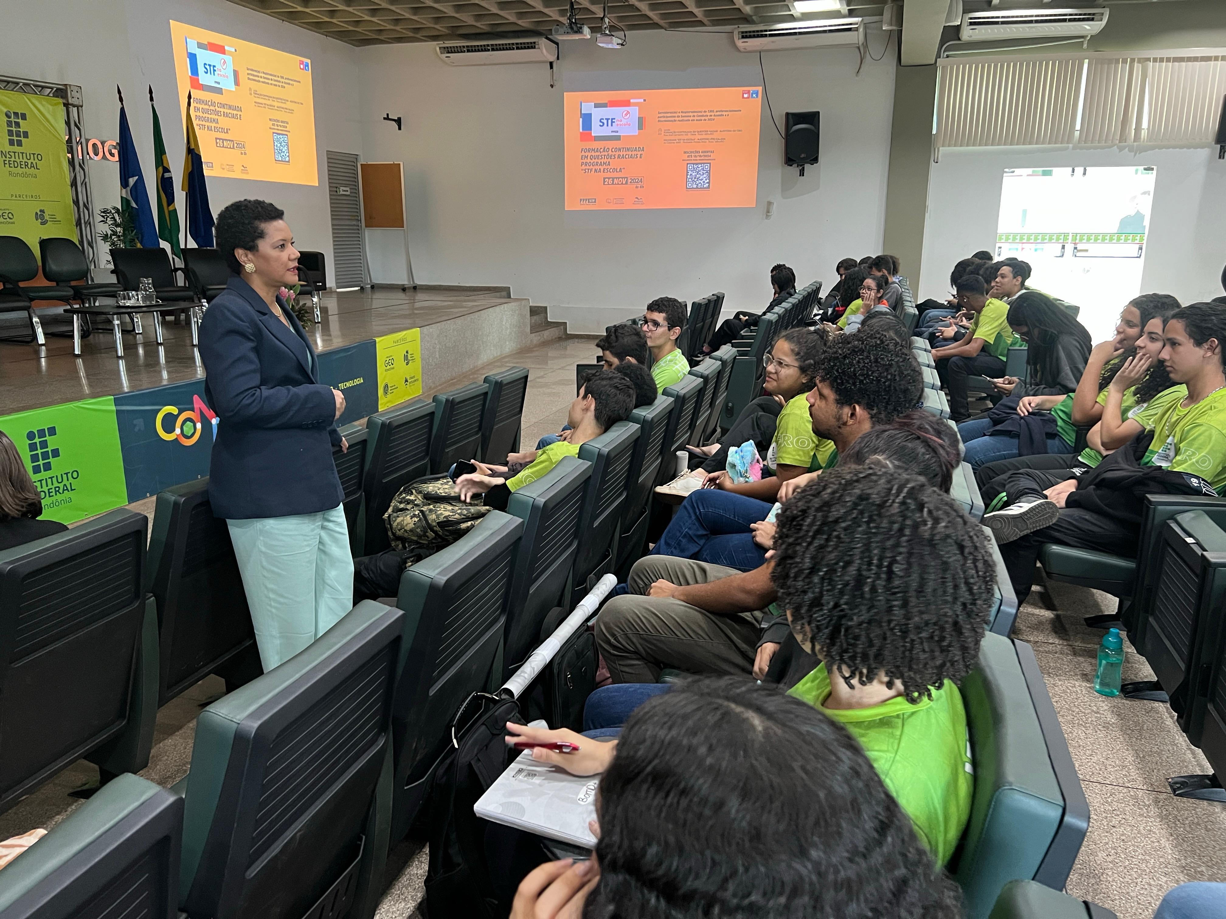 Pela tarde, Flávia Martins de Carvalho ministrou palestra pelo Programa “STF na Escola” para 250 alunos(as) no auditório do Campus Calama do Instituto Federal de Educação, Ciência e Tecnologia de Rondônia (IFRO). Essa iniciativa de educação cidadã do Supremo foi voltada para estudantes do ensino fundamental e médio, explicando de maneira didática e acessível o papel e atribuições do STF, a importância da Constituição Federal, direitos e deveres do cidadão e o funcionamento da democracia.