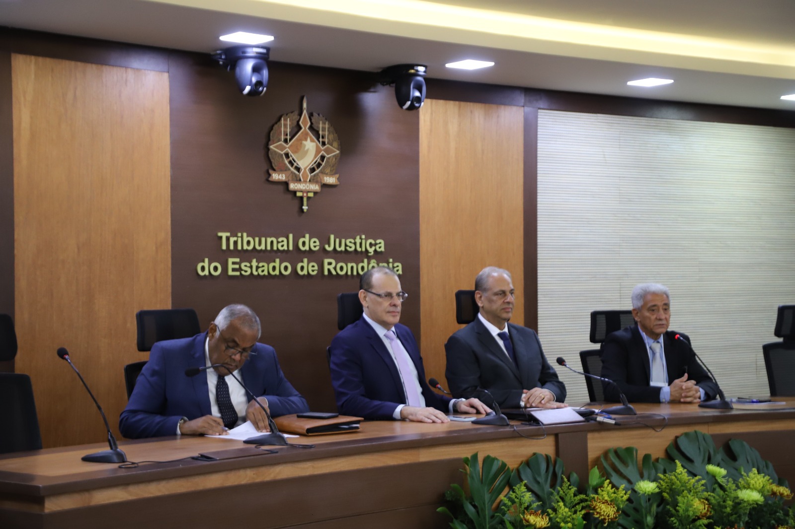 Logo cedo, magistrados(as), assessores(as), advogados(as), acadêmicos(as) e o público em geral lotaram o auditório do Tribunal de Justiça de Rondônia. A mesa de abertura do evento foi composta pelo Diretor da Emeron, desembargador Alexandre Miguel, Presidente do TJRO, desembargador Raduan Miguel Filho, Corregedor-geral da Justiça, desembargador Gilberto Barbosa, e o Presidente do Colégio Permanente de Supervisores dos Grupos de Monitoramento e Fiscalização do Sistema Carcerário e Socioeducativo, desembargador José Jorge Ribeiro da Luz.