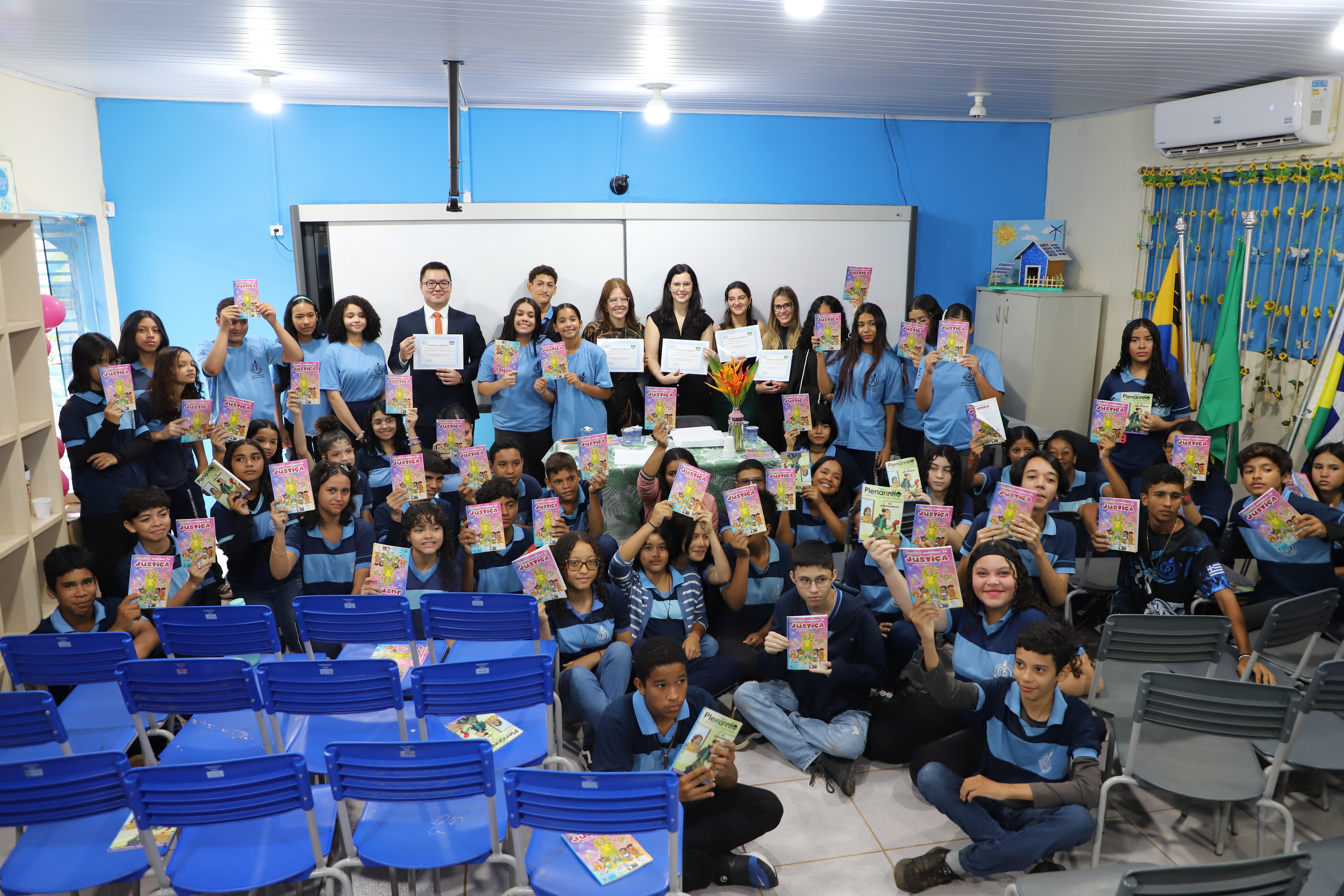 Os estudantes receberam uma cartilha ilustrada em formato de quadrinhos, protagonizada por dois personagens principais: o Brasilzinho, que representa o espírito da Bandeira Nacional e traz curiosidades sobre o país, e Têmis, a deusa da Justiça, que explica de maneira lúdica os direitos e deveres. Com linguagem simples e interativa, o material facilita a compreensão de temas jurídicos e contribui para a formação cidadã das crianças.