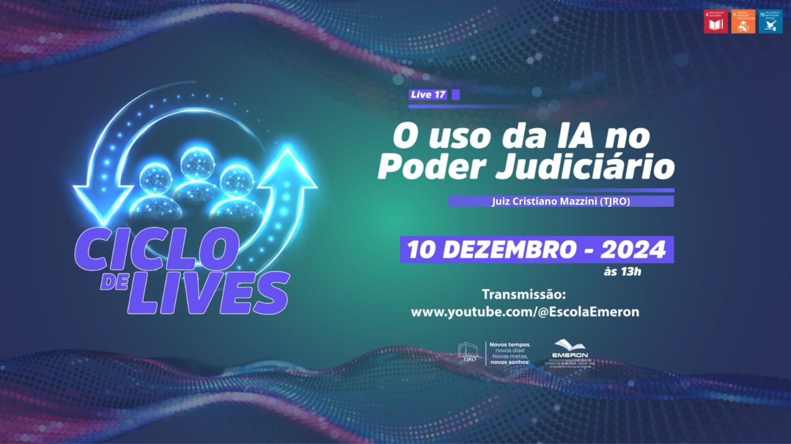 O ciclo de lives "O uso da IA no Judiciário", realizado pela Emeron, conta, nesta terça-feira (10), com a participação do juiz Cristiano Gomes Mazzini, da 8ª Vara Cível da Comarca de Porto Velho.