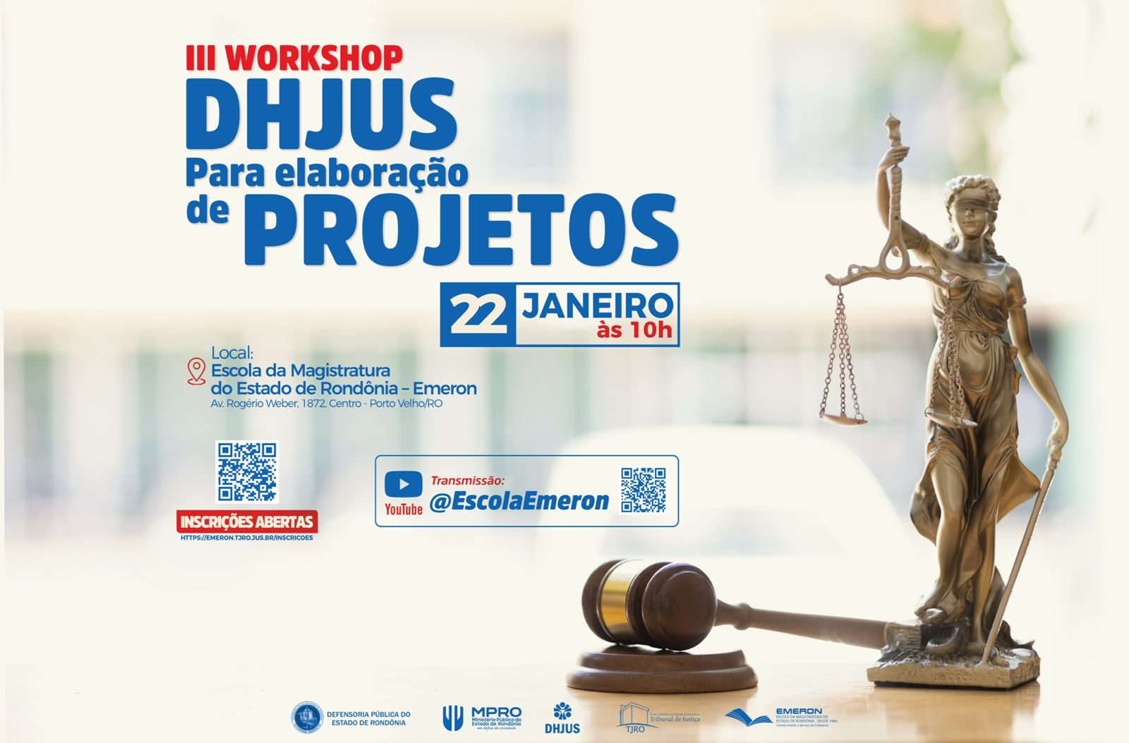 Local: EMERON (Escola da Magistratura de Rondônia) e também com transmissão online pelo canal oficial da EMERON no .