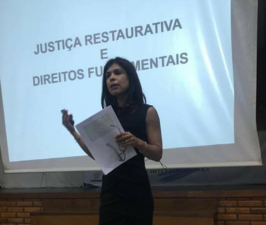Finalizando o evento, a Juíza do Tribunal de Justiça do Distrito Federal Catarina de Macedo apresentou o conceito de Justiça Restaurativa, as legislações vigentes sobre o assunto, e as boas práticas de sua comarca na área.