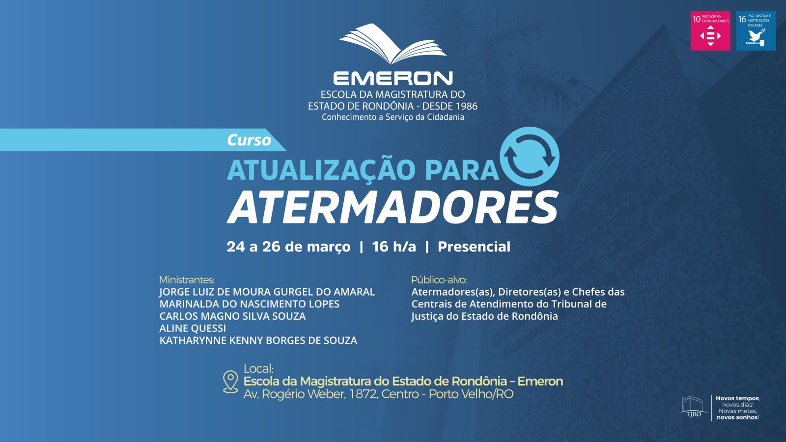 A Escola da Magistratura do Estado de Rondônia (Emeron) realizará, entre os dias 24 e 26 de março, o curso Atualização para Atermadores, destinado a servidores(as) do Tribunal de Justiça de Rondônia (TJRO). A formação ocorrerá na sala 104 da Emeron, em Porto Velho, e tem como objetivo capacitar os participantes para aprimorar o atendimento ao público e a eficiência na tramitação dos processos.