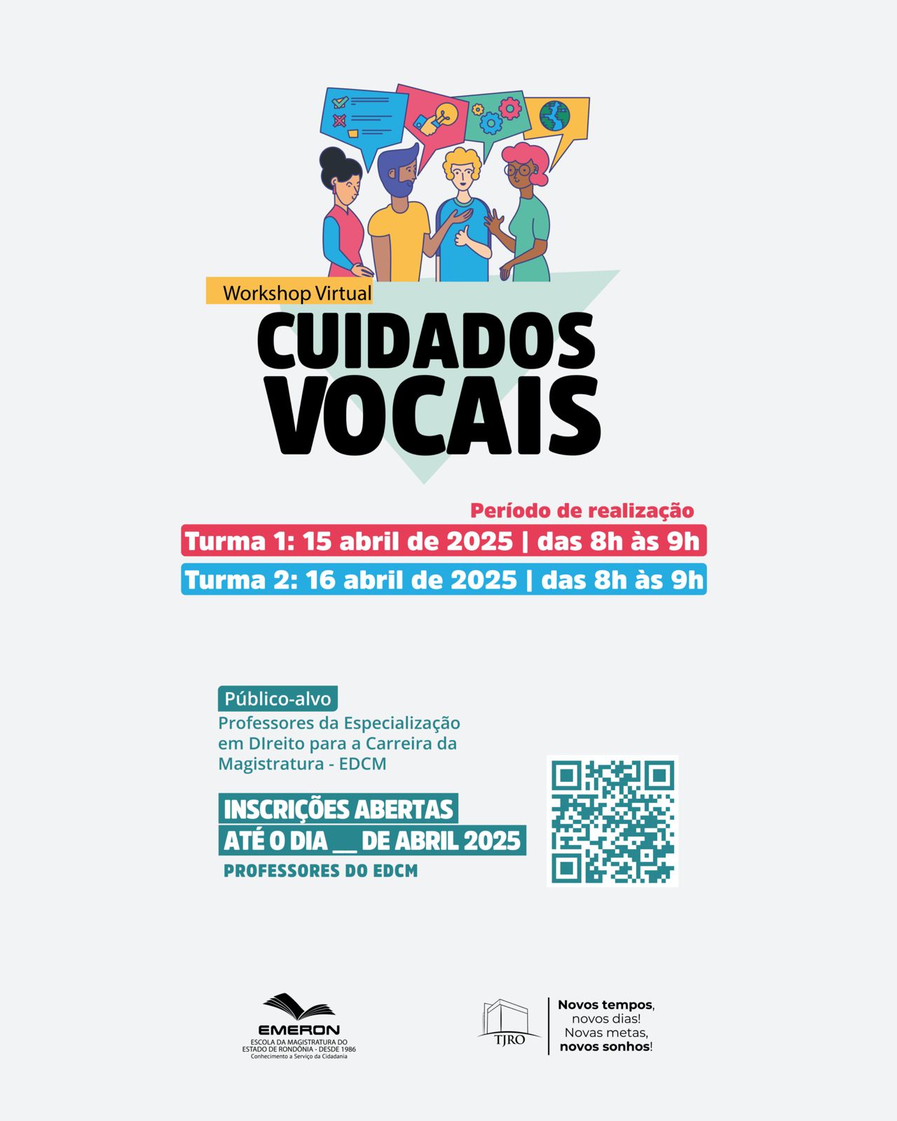 A Escola da Magistratura do Estado de Rondônia (Emeron) informa aos(às) magistrados(as) inscritos(as) para participarem do “Workshop Virtual de Cuidados Vocais”, destinado aos professores do Curso EDCM, que será realizado no dia 15 de abril, das 8h às 9h, por meio da plataforma Google Meet.