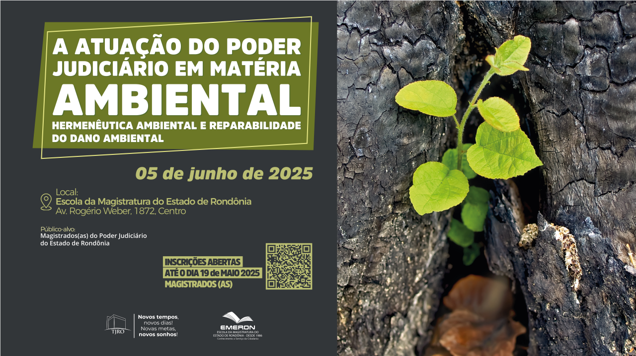 A Escola da Magistratura do Estado de Rondônia (Emeron) está com inscrições abertas para o curso “A atuação do Poder Judiciário em matéria ambiental: hermenêutica ambiental e reparabilidade do dano ambiental”, que será realizado no dia 5 de junho, na sala 102 da Emeron.