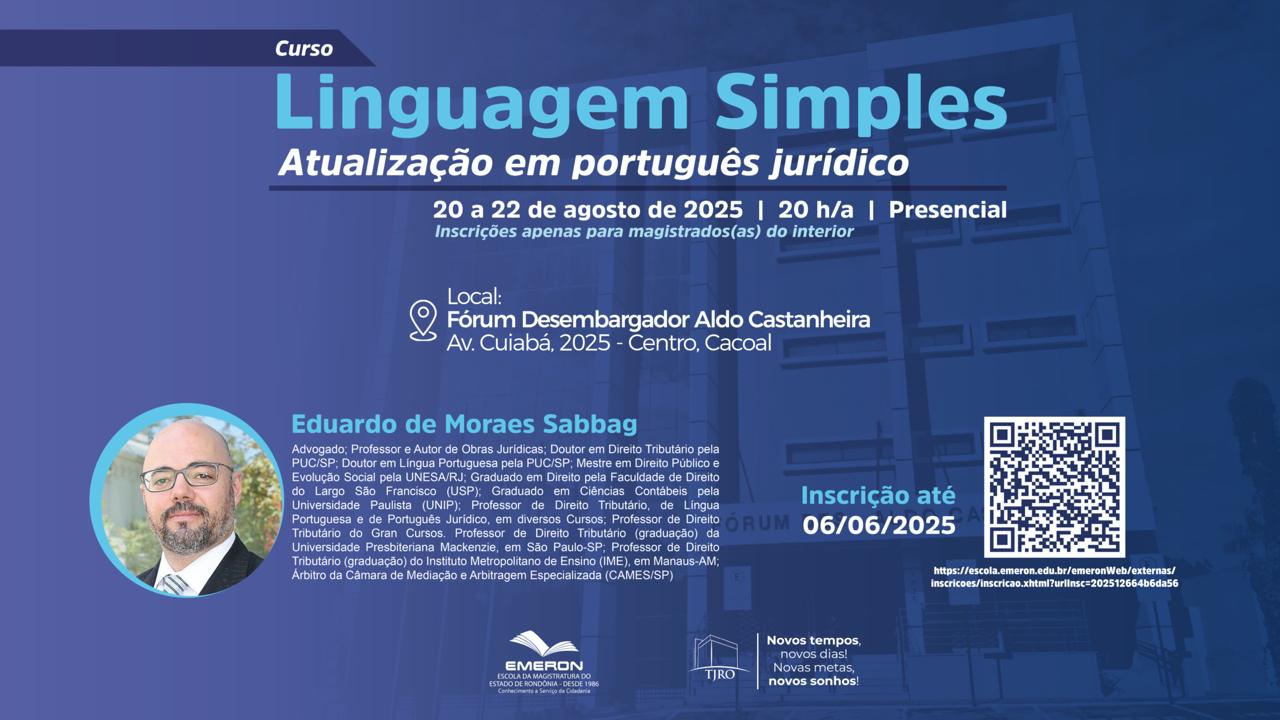 A Escola da Magistratura do Estado de Rondônia (Emeron) realizará o curso Atualização em Português Jurídico, presencialmente em Cacoal nos dias 20, 21 e 22 de agosto de 2025. As inscrições podem ser realizadas por magistrados(as) do interior até o dia 6 de junho, na página da Emeron (emeron.tjro.jus.br/inscricoes).