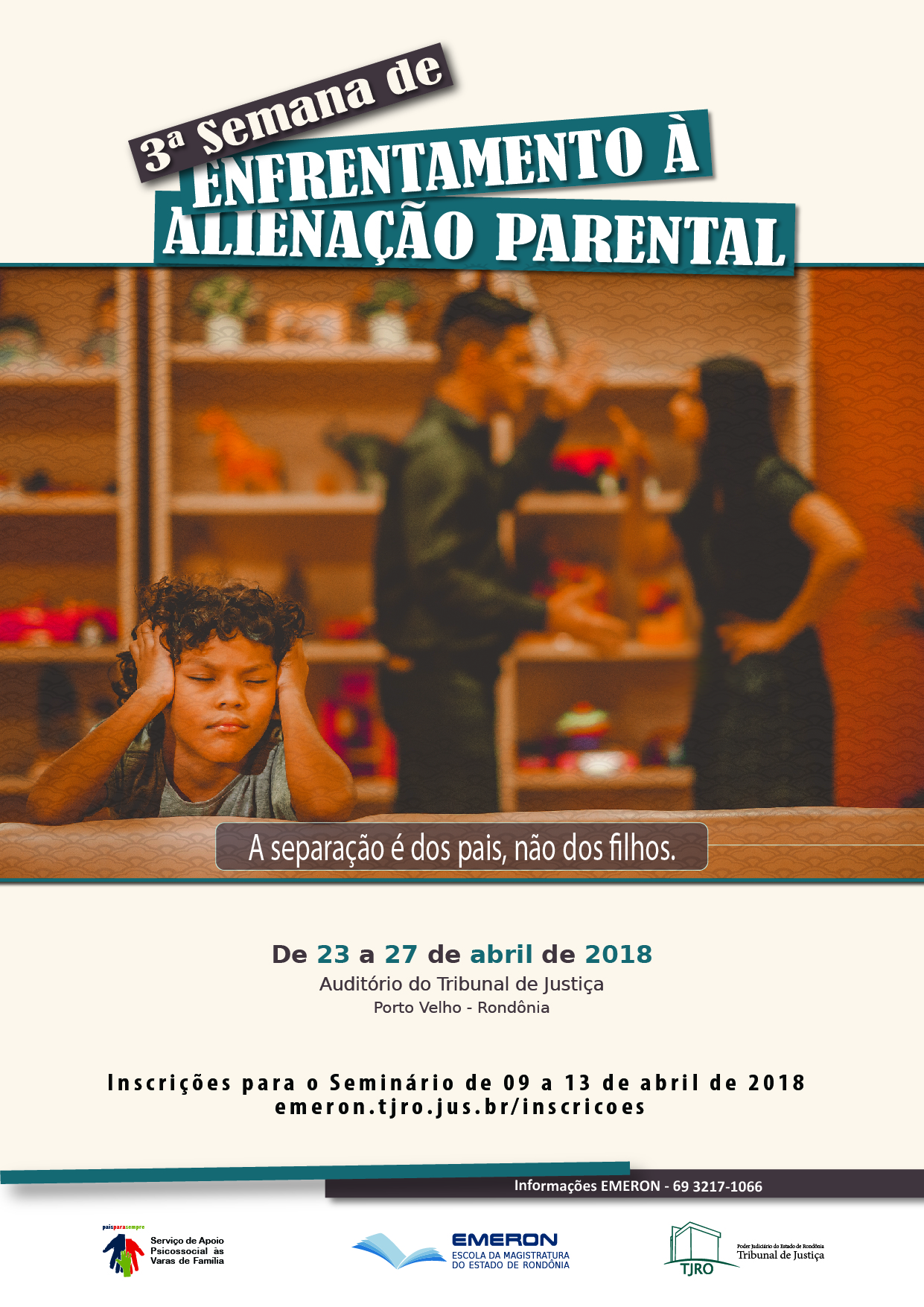O Poder Judiciário de Rondônia, por meio do Serviço de Apoio Psicossocial às Varas de Família de Porto Velho (SAPVF), promoverá, de 23 a 27 de abril, a III Semana de Enfrentamento à Alienação Parental, voltada para profissionais que lidam com o tema. A programação da semana na inclui um seminário, palestras e capacitação.