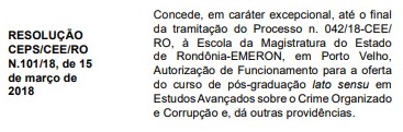A Emeron já oferece especializações em Direito para a Carreira da Magistratura (EDCM) e em Gestão Cartorária Judicial (GESC). A implantação da nova pós-graduação lato sensu foi autorizada pelo CEE, da Secretaria de Estado da Educação (SEDUC), com a publicação da Resolução N. 101 no Diário Oficial de Rondônia do último dia 4 de abril. O curso tem por escopo as modernas ferramentas técnico-jurídicas para combate e controle da corrupção e das organizações criminosas (Orcrim), tanto as de característica mafiosa quanto as empresariais, buscando, por intermédio das ciências criminais, lastro teórico e prático para enfrentamento dessa nova realidade. Para um dos professores e diretor da Emeron, desembargador Marcos Alaor Diniz Grangeia, a especialização “trará para Rondônia a expertise em área tão em voga no atual cenário político nacional”.