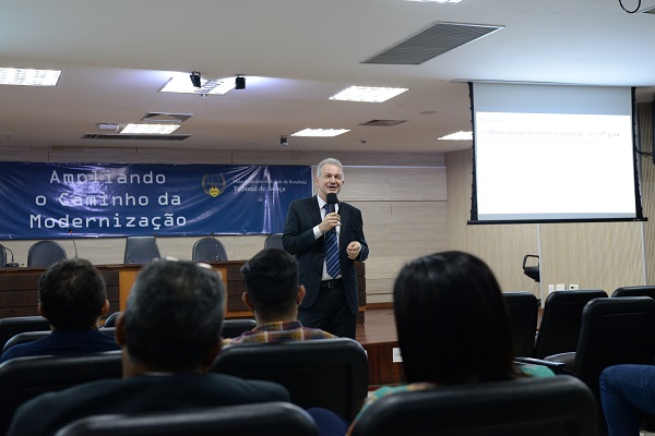 Após apresentar um histórico da gestão e da governança no Judiciário brasileiro, o palestrante abordou os resultados comparados da Justiça estadual no Justiça em Números, do Conselho Nacional de Justiça (CNJ) – especialmente em relação ao tempo médio de tramitação dos processos e à produtividade de magistrados e servidores –, bem como as práticas de sucesso dos Tribunais de destaque. Segundo Joel, “a qualidade da decisão é função da qualidade da informação e, portanto, quanto mais e melhor informação, melhor a decisão”. Ele disse que, apesar de Rondônia já ser selo ouro no Justiça em Números, para chegar à categoria diamante, precisaria melhorar seus índices gerais de tempo médio de tramitação e produtividade em torno de 14%.
