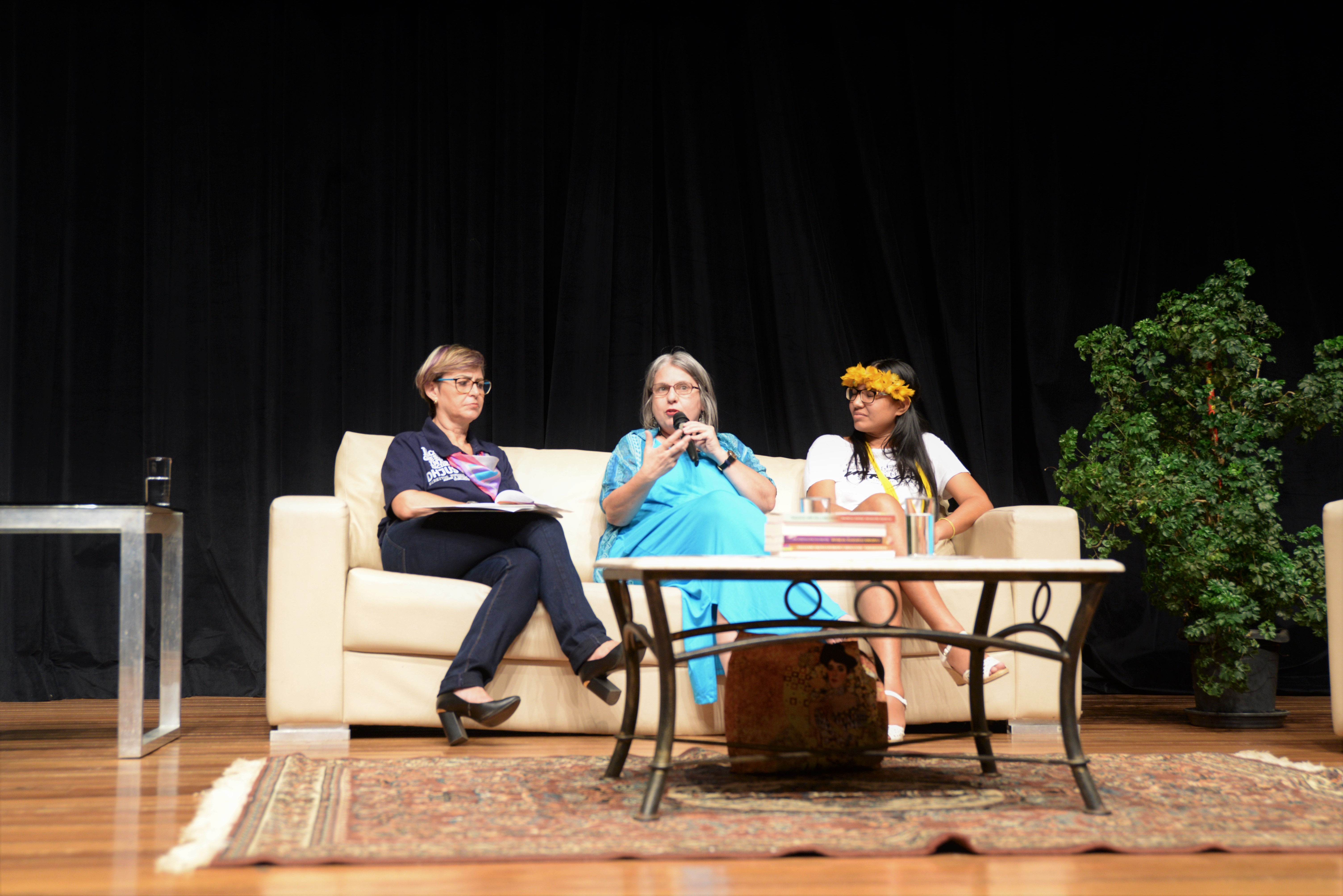 Após a abertura, a professora Aparecida Zuim conduziu o debate “Diálogos – Direitos Humanos, acesso à Justiça e movimentos sociais” com a líder indígena Patrícia Juruna e a pesquisadora Miriam Grossi. Entre os temas abordados na conversa, as questões que envolvem a mulher indígena e não indígena foram destaque. Ao se apresentar para a plateia, Miriam lembrou que ao longo de sua carreira lidou com a falta de espaço dada a discussão de questões sobre mulheres e que se sente feliz ao perceber que houve uma grande mudança nas novas gerações e que agora se estuda coisas que antes eram faladas apenas de forma privada. Para ela, isso requer “uma triangulação entre movimentos sociais, universidade e estado” para que esses temas sejam refletidos por vários aspectos e de forma a produzir conhecimento para as gerações vindouras.