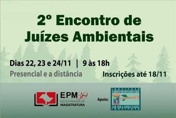 A Escola Paulista da Magistratra (EPM) está com inscrições abertas para 40 vagas presenciais e 200 vagas na modalidade a distância, no 2º Encontro de Juízes Ambientais, que será realizado nos dias 22, 23 e 24 de novembro pela Escola, com o apoio do Instituto “O Direito por um Planeta Verde”. O evento é destinado a magistrados do Tribunal de Justiça de São Paulo e de outros tribunais e visa a troca de experiências e a discussão sobre o exercício da jurisdição ambiental nas várias partes do país.