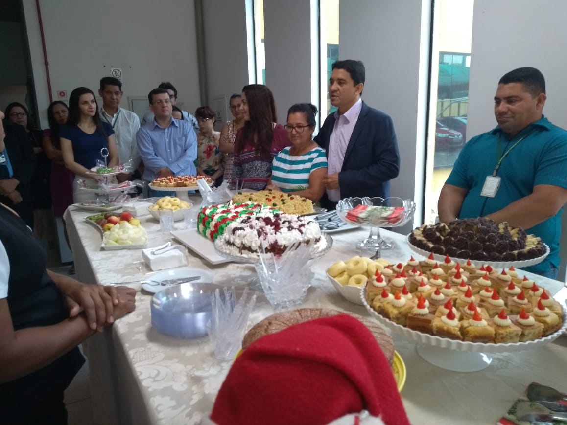 O último dia de expediente de 2018 foi marcado, na Escola da Magistratura do Estado de Rondônia (Emeron), por uma confraternização entre os servidores e terceirizados que prestam serviço na Escola. A mesa de café da manhã ganhou árvores natalinas, pinheiros e claro, o bom velhinho, para celebrar o encerramento do ano de trabalho.