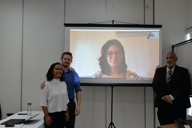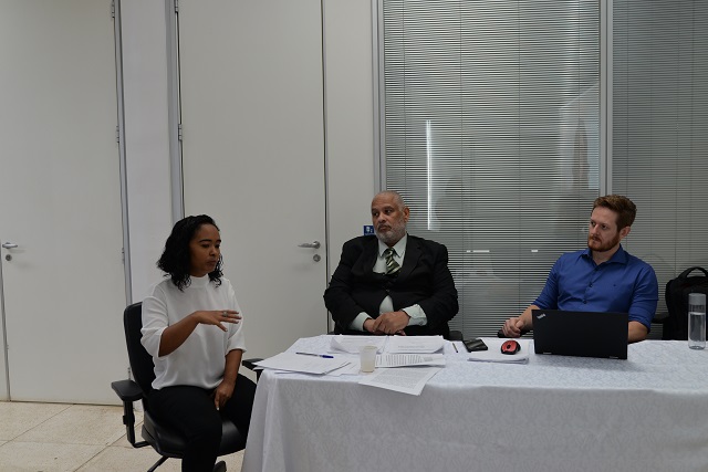 A banca foi formada pelos professores doutores Márcio Secco, que orientou o trabalho, Delson Xavier e Raffaella Pallamolla, que participou por videoconferência.
