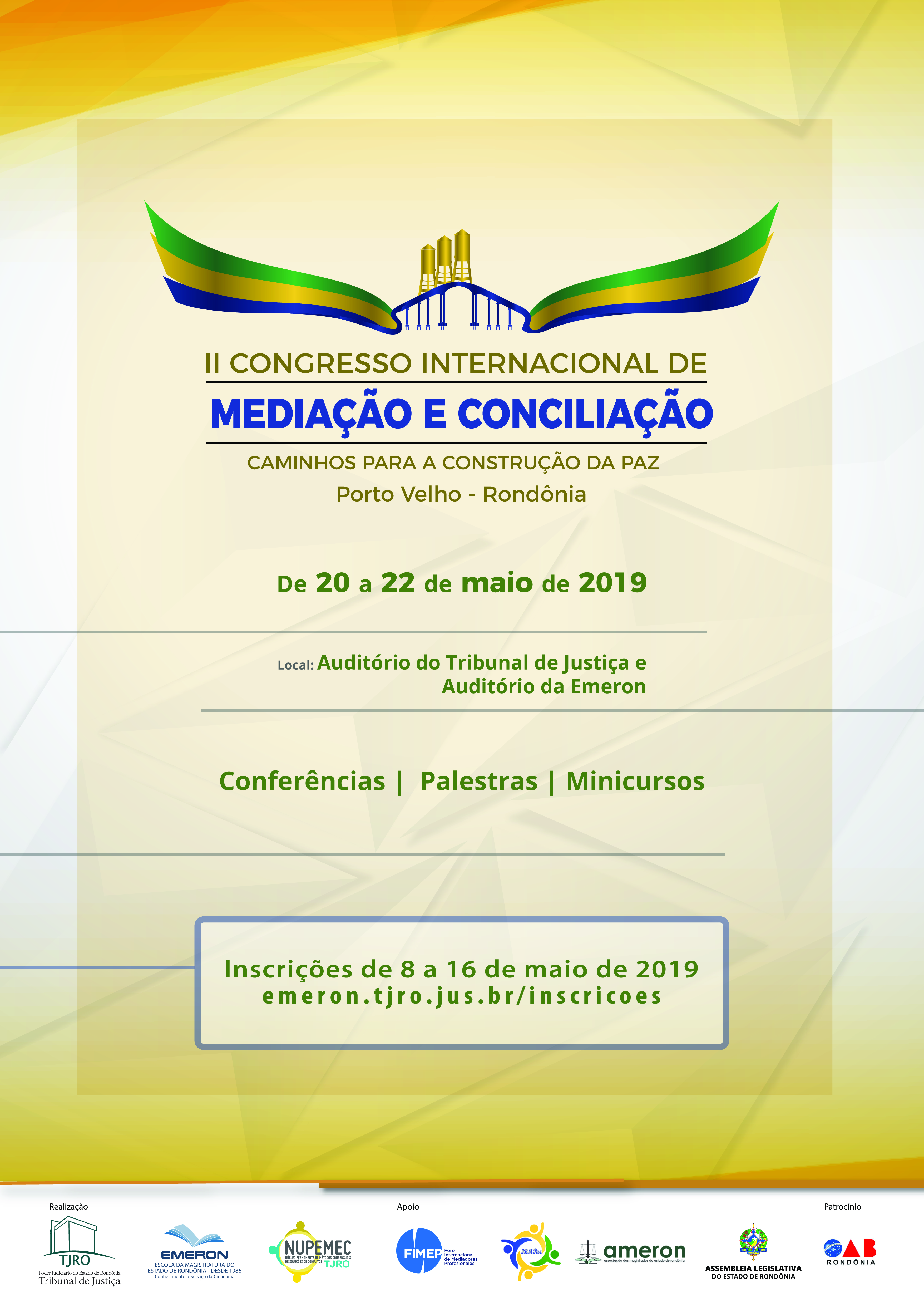 A Escola da Magistratura do Estado de Rondônia (Emeron) abriu inscrições para o II Congresso Internacional de Mediação e Conciliação, que acontecerá no período de 20 a 22 de maio de 2019, em Porto Velho. O evento é gratuito e oferece 185 vagas ao público geral.